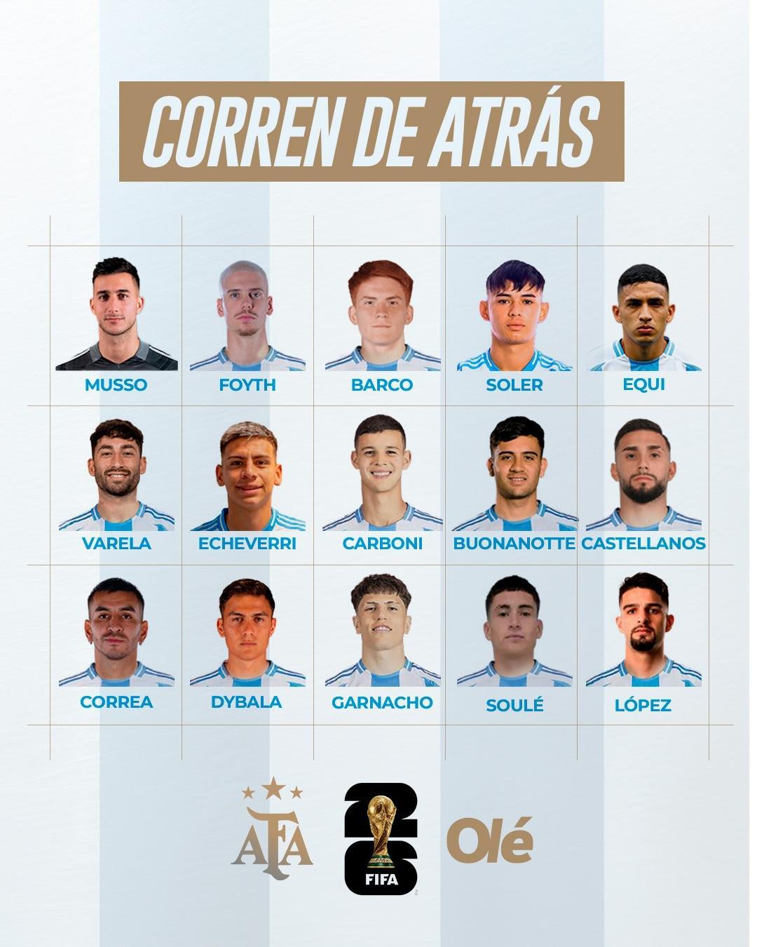 《奥莱报》认为,有15名球员如无意外将会铁定入选阿根廷国家队明年世界杯的参赛名单,这15名球员分别是:门将达米安-马丁内斯和鲁利,后卫克里斯蒂安-罗梅罗、莫利纳、利桑德罗-马丁内斯、奥塔门迪、塔利亚菲科,中场德保罗、帕雷德斯、恩佐-费尔南德斯、麦卡利斯特,前锋梅西、胡利安-阿尔瓦雷斯、劳塔罗以及蒂亚戈-阿尔马达。
