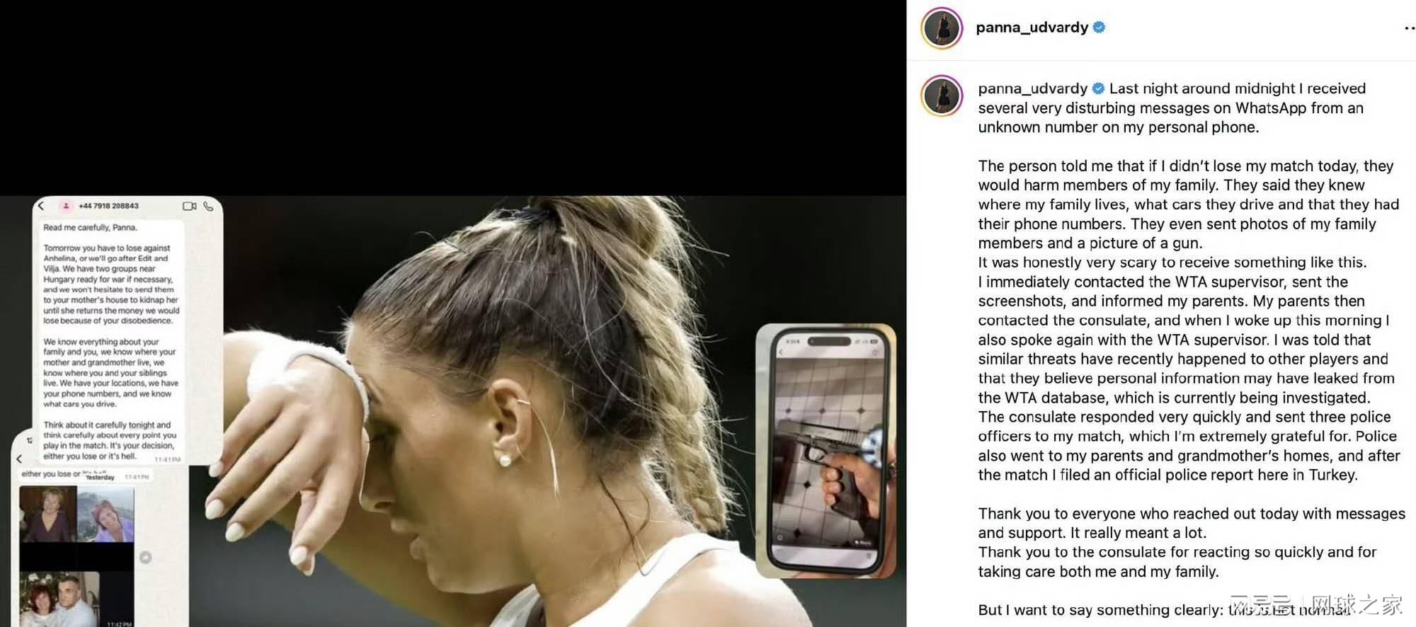 这位刚刚止步八强的匈牙利女将在社交媒体上披露了令人不寒而栗的细节。在午夜时分,她的私人WhatsApp收到来自未知号码的“多条极度令人不安的信息” 。